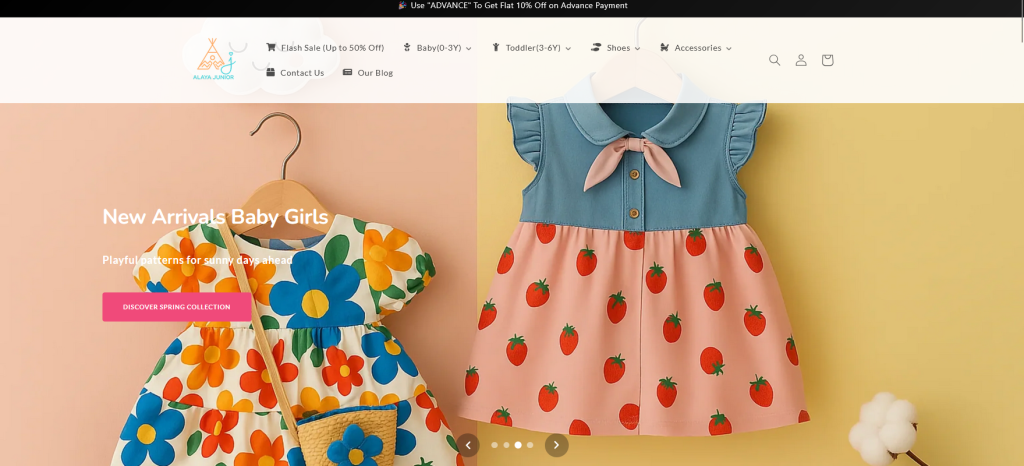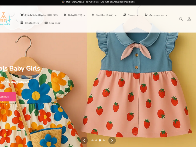 The client, Alayas Junior, wanted a soft, elegant, and fully functional e-commerce website dedicated to baby girl clothing and accessories. The goal was to develop a user-friendly online store that reflects the brand’s delicate and adorable product range while providing smooth navigation, mobile responsiveness, and easy checkout functionality.